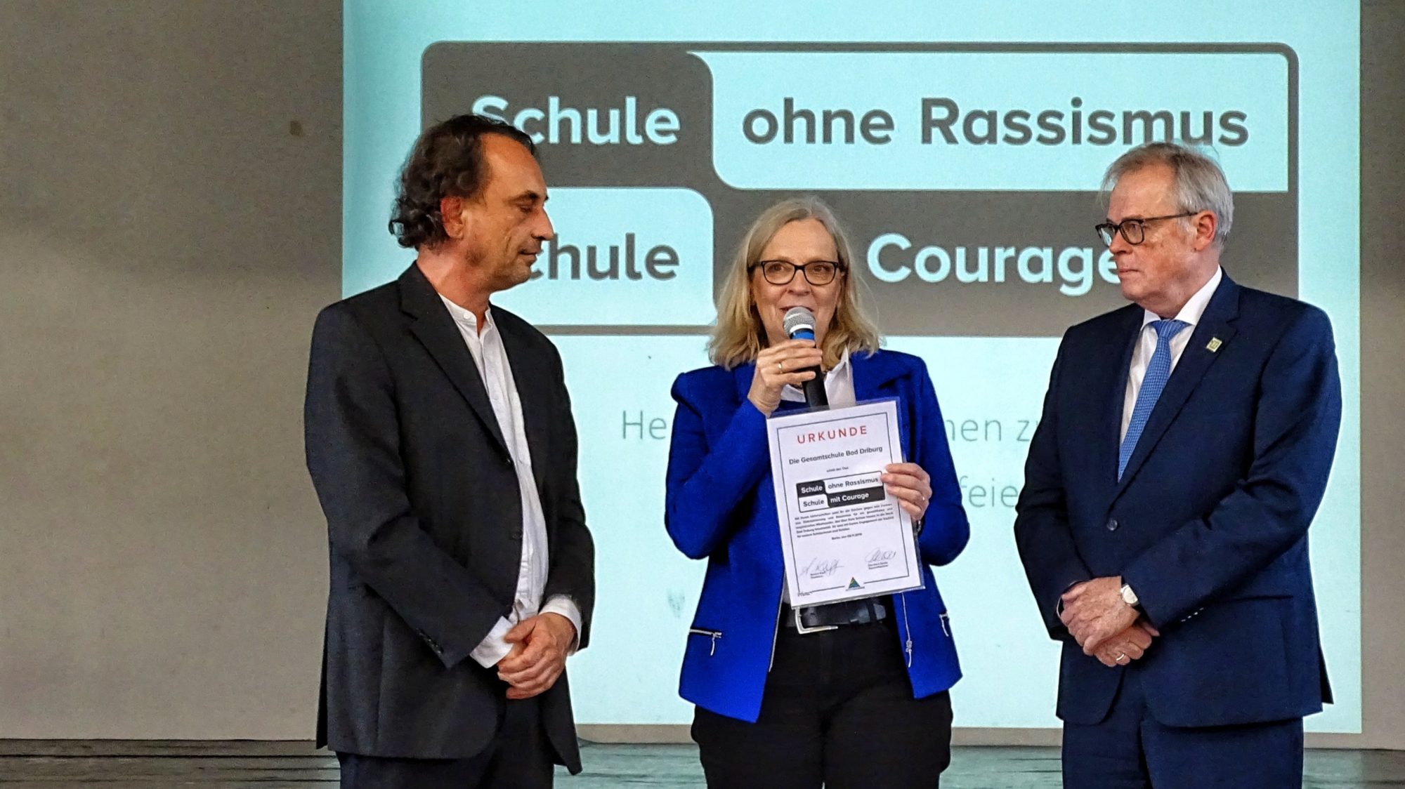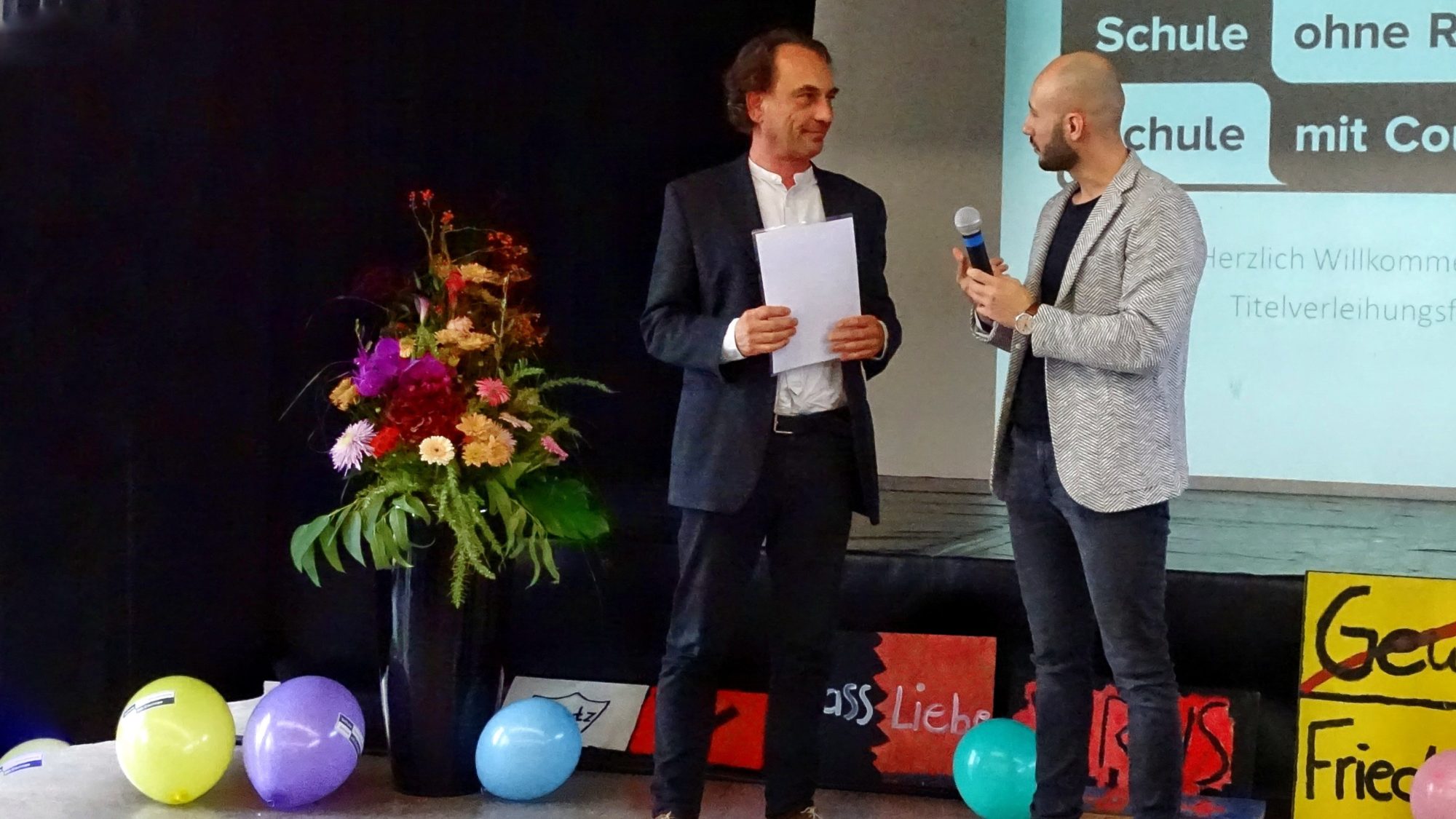 Der freudige Anlass der Feierstunde war die Verleihung des Titels ➡️ „Schule ohne Rassismus – Schule mit Courage“. Schulleiterin Brigitte Köhler-Thewes nahm die Urkunde von Regionalkoordinator Rüdiger Gleisberg (Kommunales Integrationszentrum) entgegen.