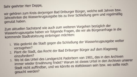 Bürgermeister nimmt Stellung Elisabeth Affani Bad Driburg. Zu der Sitzung des Stadtrates am 31. März wurde eine Bürgeranfrage eingebracht. Sie kam aus dem Kreis der Bürgerinnen und Bürger, die seit Jahren oder sogar Jahrzehnten die Wasserkrugausgabe gern und oft genutzt haben, bevor sie nun durch den Badbetreiber geschlossen wurde.Die Anfragenden wollten wissen, ob die Stadt … Bürgeranfrage zur Wasserkrug-Ausgabe am Brunnen weiterlesen