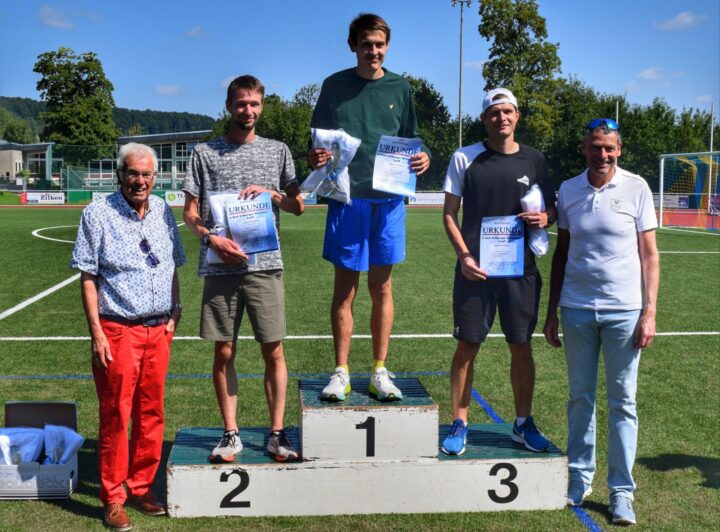 Altbürgermeister Heinrich Brinkmöller, Platz 2 Pascal Kleibrink (7C Run Team), Sieger Simon Leßmann (TV “Jahn” Bad Driburg), Platz 3 Mikhail Nasekin (ohne Verein), Marcus Graf von Oeynhausen-Sierstorpff
