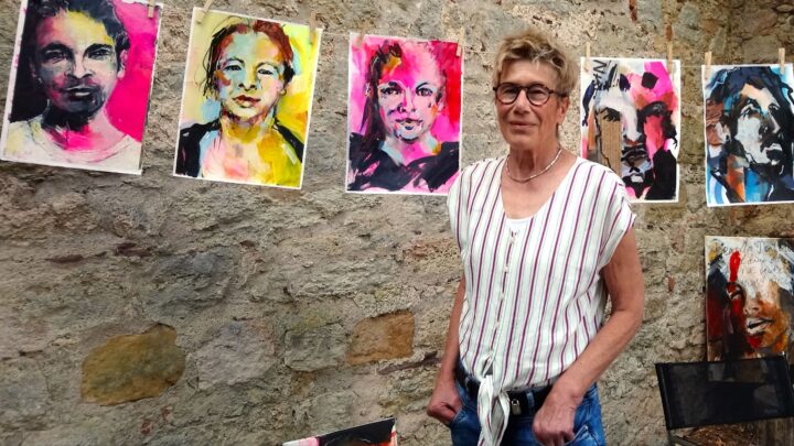 Auch Heidi Lange-Kallerhoff war mit ihren Werken vertreten. Ihr Fokus liegt u.a. auf Porträts, die sie aus Urlaubssituationen entwickelt – oft inspiriert von spontanen Begegnungen. Daraus entstehen anschließend Zeichnungen, etwa von einem Strandverkäufer in Thailand oder Schauspielern vom Theater Paderborn. Die Farbstimmung spielt dabei für sie eine zentrale Rolle. Die Teilnahme an der Sommerakademie in Paderborn wurde zu ihrem künstlerischen Durchbruch.