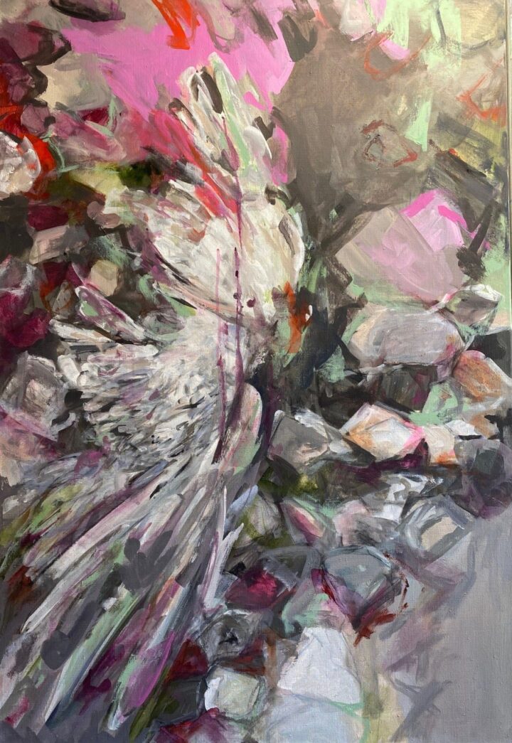 Ein farbenprächtiges Gemälde Maria Föckings zieht die Betrachtenden an. Doch dann lesen sie die Beschreibung „Taube im Gleisbett“ und erkennen, dass dem bunten Vogel der Kopf fehlt. Im letzten Winter fand die Künstlerin im Atelier auf der Fensterbank einen toten Schmetterling, ein Pfauenauge. „Wie lange hat er gelebt? Ein Jahr? Einen Tag? Hat er sich in mein Atelier geflüchtet vor der Kälte?“ Mit Acryl auf Nessel lässt sie das Bild entstehen, das sie am Ende „Schmetterlingsherz“ nennt.