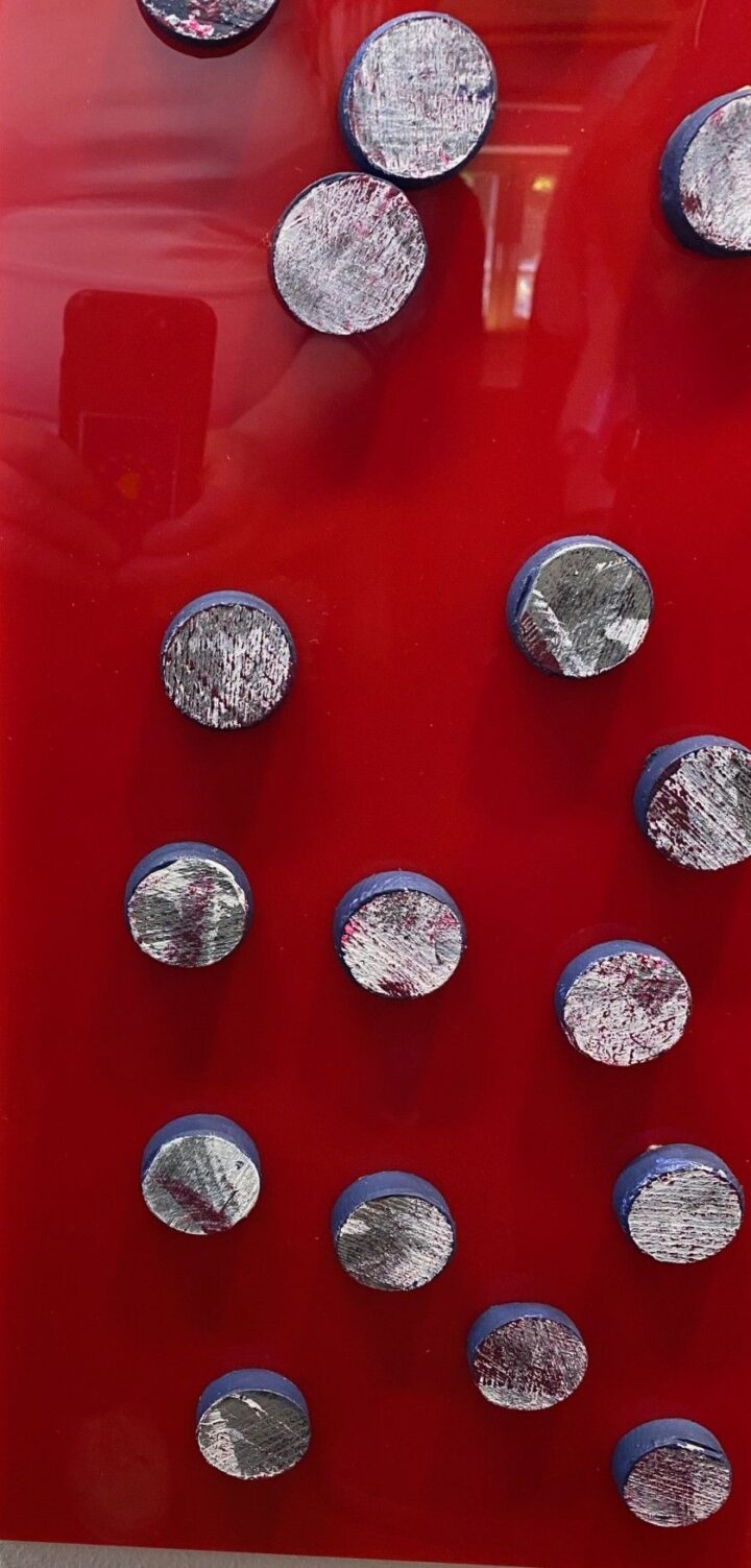 Für Elisabeth Jux-Hiltrop steht das Experiment im Mittelpunkt. „Es darf fragmentarisch, widersprüchlich oder offen sein.“ Eine ihrer Sammlungen heißt „Für jeden Monat eins“. Auf flammendrotem Hintergrund präsentiert sie Holzscheiben „Ohne Titel“ und überlässt die Betrachtenden ihren eigenen Eindrücken.