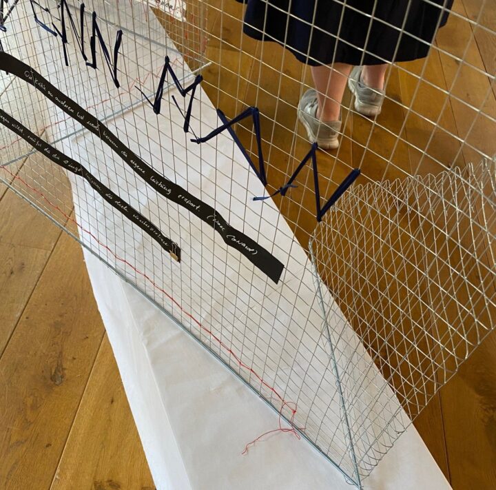 Zwischentöne und Dissonanzen findet man auch bei Bringfriede Fokken-Eichner, etwa in ihrer Raum-Installation „… nur ein Jahr“ aus Draht, Papier, Garn und Stoff. Sie hat darin Zitate verarbeitet wie den berühmten Satz von Immanuel Kant: „Habe Mut, dich deines eigenen Verstandes zu bedienen.“ Wer sich über das Kunstwerk beugt, kann auch ein Zitat von Astrid Lindgren lesen: „Es ist gefährlich, zu lange zu schweigen. Die Zunge verwelkt, wenn man sie nicht gebraucht.“ Einfach zu entziffern sind die Lebensweisheiten nicht. Die Stellung beim Lesen zu verändern könnte am Ende bedeuten, die eigene Einstellung zu ändern und somit die Welt zu verändern.