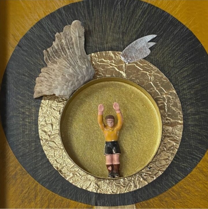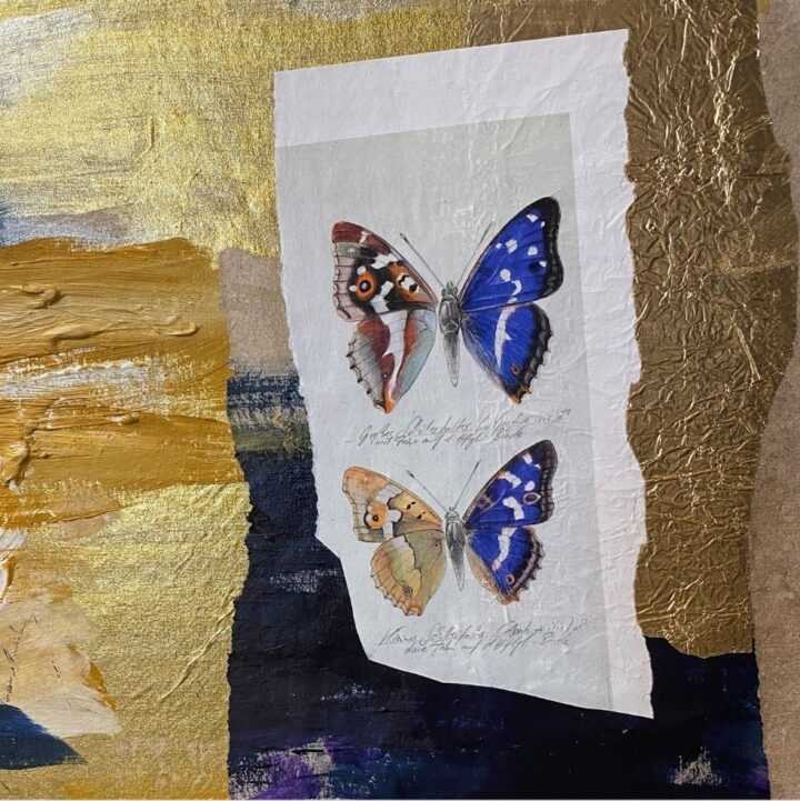 In ihrem „Gruß an Maria“ greift Vera Jeserich das Falter-Motiv auf. Die Schmetterlinge in ihrer Collage glänzen, sie wirken real, doch ihre Flügel passen nicht zueinander. Die Künstlerin lässt aus Alltäglichem ein persönliches Mosaik entstehen, „ein Jahr voll leiser Geschichten, die sich zwischen Farbe, Fundstücken und Pflanzen entfalten dürfen“. Ein Exponat trägt den Namen „Himmelsstürmer“ und lässt im Kopf des Betrachtenden eigene Geschichten entstehen.