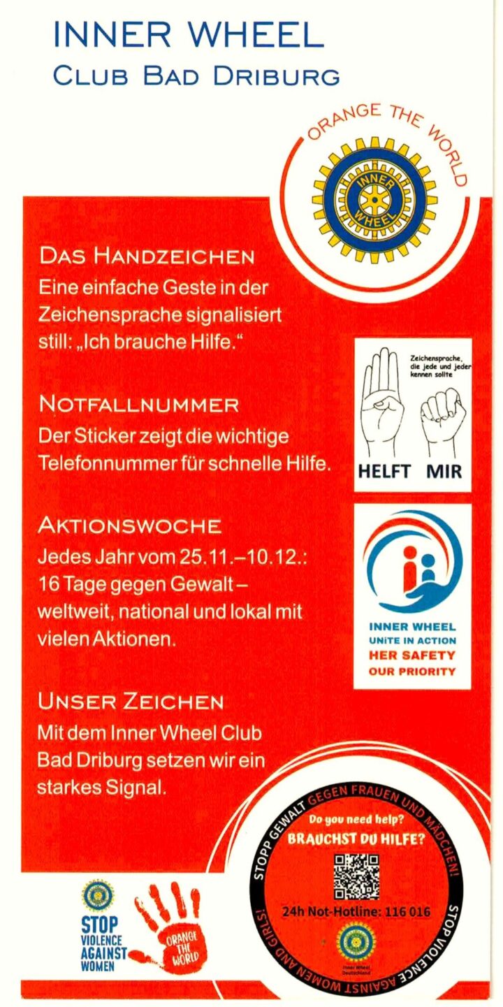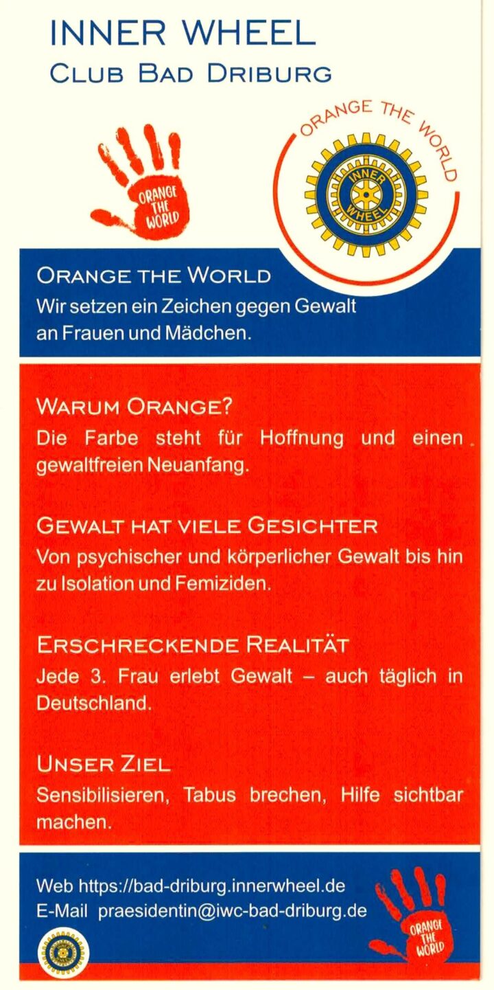 Auch in Bad Driburg wurde die Initiative in diesem Jahr intensiv aufgegriffen. Die Präsidentin des Inner Wheel Clubs Bad Driburg Ulrike Steinwart äußerte: „Wir beteiligen uns gemeinsam daran, aufmerksam zu machen, zu sensibilisieren und konkrete Zeichen zu setzen. Bereits bei der Buch- und Spielebörse Anfang November trugen wir orangefarbene Schleifen bzw. Tücher.“ Orange Schirme dienten zusätzlich als Blickfang.