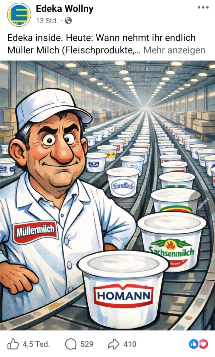 Genau diese Debatte hat der Edeka-Markt Wollny mit seiner ausführlichen Stellungnahme zur Forderung, Müller Milch, Fleischprodukte, Tabak und Alkohol aus dem Sortiment zu nehmen, neu entfacht.