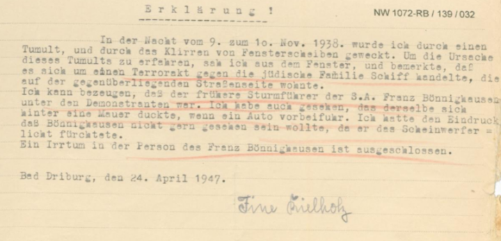 Zusätzliche Zeugnisse bestätigen die gezielte Brutalität der Übergriffe. Der Postsekretär Anton Humbert schilderte in einer eidesstattlichen Erklärung⁴ vom 21. Februar 1948, wie Bönnighausen den schwer verletzten Walter Ulmann aus dessen Haus stieß, ihn beschimpfte und der Öffentlichkeit preisgab, bevor Ulmann von der Polizei in sogenannte Schutzhaft genommen wurde. Humbert sprach ausdrücklich von einem planmäßig vorbereiteten Überfall und einem inszenierten Volksauflauf.