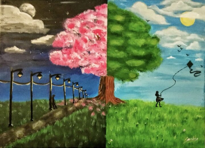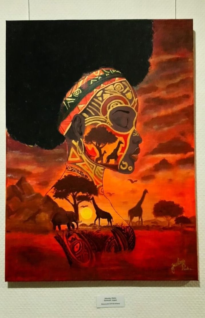Gezeigt wurden gemalte Bilder von Bewohnerinnen und Bewohnern der Zentralen Unterbringungseinrichtung (ZUE). Die Werke spiegelten persönliche Erfahrungen wider und boten Anlass für intensive Gespräche unter den Besucherinnen und Besuchern. So berichtete der 21-jährige Saidi aus Burundi, der derzeit intensiv Deutsch lernt und in einem Bad Driburger Verein Fußball spielt, von seinem Bild „Tag und Nacht“, das durch seinen starken Kontrast beeindruckte.