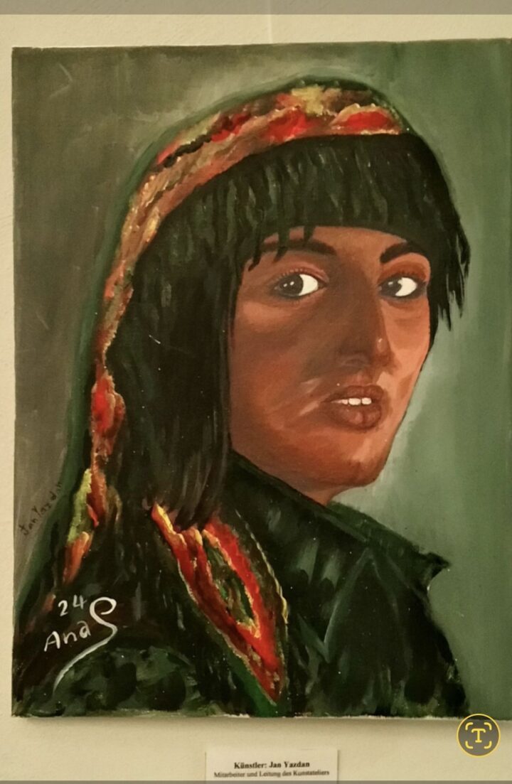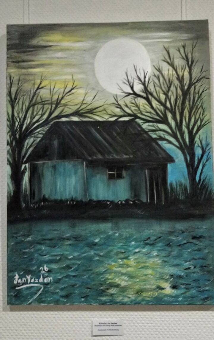 Auch Jan Yazdan, Mitarbeiter der ZUE und Leiter des Kunstateliers, stellte mehrere eigene Werke aus. Er schilderte die große Freude der Menschen, ihre Gedanken und Gefühle durch Kunst ausdrücken zu können. Für viele sei das Malen eine Form der Therapie, um Erlebtes zu verarbeiten. So erzählte er von einer 15-jährigen Asylsuchenden, die zunächst ein Bild malte und es am Ende vollständig mit schwarzen Strichen überzog – ein eindrückliches Beispiel für die Verarbeitung von Traumata.