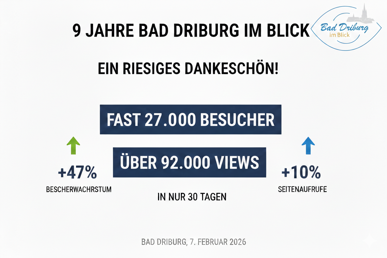 Bad Driburg im Blick Liebe Leserinnen und Leser, gerade erst haben wir am 5. Februar unser 9-jähriges Bestehen gefeiert: neun Jahre ehrenamtliche, unabhängige und werbefreie Berichterstattung – von Driburgern für Driburger. In einer Zeit, in der viele lokale Medien mit sinkenden Zahlen kämpfen, zeigt unser jüngster Blick hinter die Kulissen: Die Community wächst weiter – … Weiterlesen